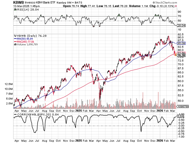 I sold out our position in the big bank exchange traded fund. This was bought a few weeks ago based on a loosening regulatory environment and strong bank balance sheets, which offered the prospect for stepped up share repurchases and/or dividend increases. But, emergence of problems in the private equity space, have led to big banks to become suspect, because they may have loaned money to some of these aggressive and obscure investment pools. This was a characteristic of the losses for banks during the Great Financial Crisis. War in the Middle East has not improved sentiment, so with the price trend turning downward I decided it was better to be safe than sorry. Every client took a loss, but a small one.